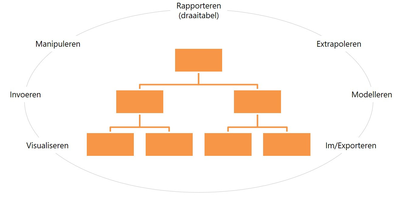 Modelleren (Editor). Achter het organigram kan een model worden “opgehangen” dat altijd aanstaat. Op dit punt lijkt onze technologie erg op Excel. Verschil is dat er langs hiërarchielijnen wordt gerekend i.p.v. langs rijen of kolommen.